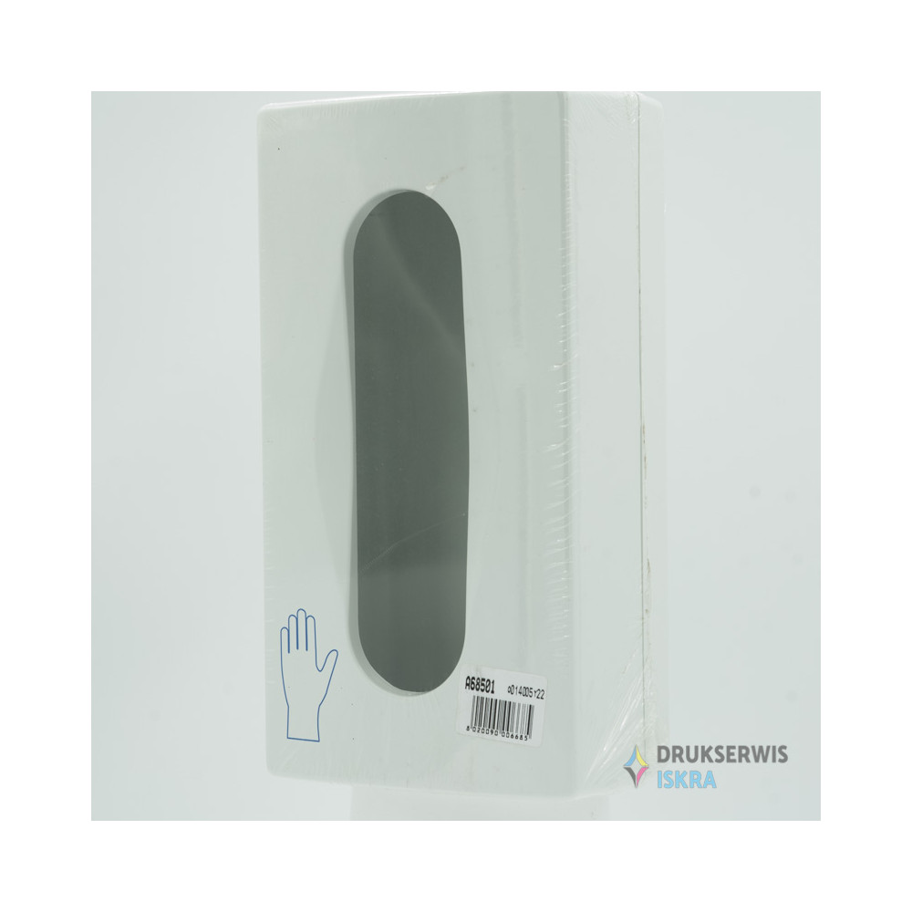 Disposable glove dispenser, mounted to the wall with screws. Holds one standard pack of disposable gloves. Helps to keep the work area tidy. Made of sturdy plastic in white. Lockable and opens with a snap. Can also be used as a holder for disposable tissues in a box.