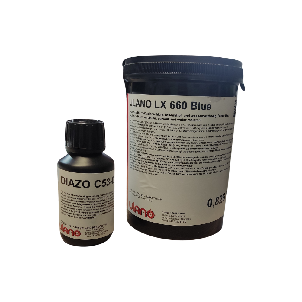 ULANO LX 660 BLUE to wysokiej jakości emulsja diazo-fotopolimerowa odporna na działanie rozpuszczalników i wody. Przeznaczona do wykonywania precyzyjnych matryc sitodrukowych, zapewnia wyjątkową trwałość i odporność na farby wodne, rozpuszczalnikowe oraz kleje dyspersyjne.
