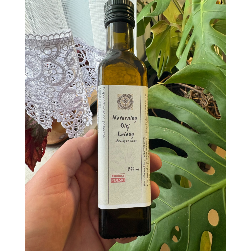 Olej lniany tłoczony jest na zimno z ziaren lnu pochodzących z naszych upraw na Roztoczu oraz z terenów nadwiślańskich. Ma delikatny, charakterystyczny smak i słomkową barwę. To olej, który najlepiej smakuje i działa stosowany na zimno, jako dodatek do gotowych potraw.